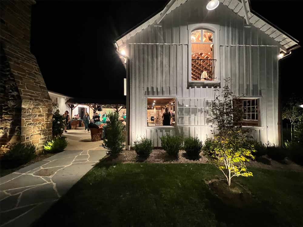 The Barns at Crest Hill Main Climate-Controlled Barn Wedding Reception at Night